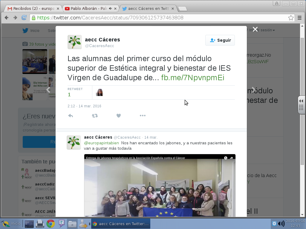 Hoy nos hemos encontrado con una bonita sorpresa. La Asociación Española contra el Cáncer Cáceres, nos menciona en twitter y facebook y nos da las gracias por acordarnos de todos esos pacientes que sufren esta terrible enfermedad y por hacerles entrega, de forma simbólica, de todos esos jabones naturales que hace unos días elaboramos en el módulo de Cosmetología en nuestro instituto.