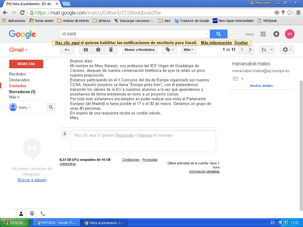 Hoy hemos dado un paso más, hemos comenzado a orgnizar con la ayuda de nuestras profesoras una visita a las oficinas del Parlamento Europeo en Madrid. Os dejamos el email que les hemos enviado, como muestra de nuestro compromiso y las ganas que tenemos de familiarizarnos y conocer mucho más sobre Europa y la Unión Europea. Esto pinta bien, pero...¿nos contestarán?